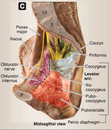 2. Levator ani: Levator ani is made up of three muscles, which collectively form the majority of the pelvic diaphragm. Together, these muscles raise the pelvic floor, which increases intra-abdominal pressure during urination, defecation, vomiting, and parturition.
