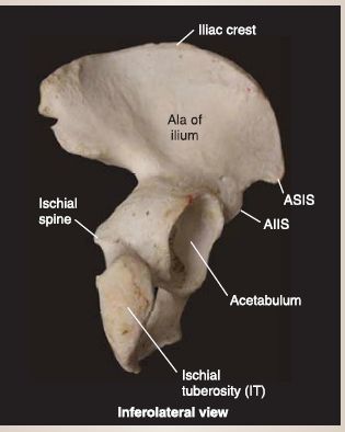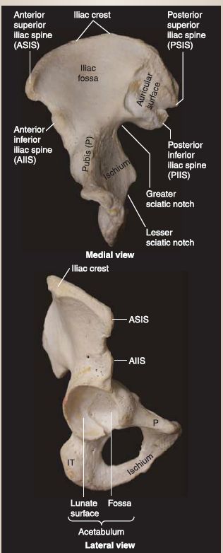 As shown in Figure 1, in the adult, each hip bone is formed by the fusion of three bones: ilium, ischium, and pubis. The acetabulum, which serves as the socket portion of the hip joint, is formed where all three bones intersect laterally. Right and left hip bones are joined posteriorly by the sacrum through the sacroiliac joint and anteriorly at the pubis symphysis-forming the ring-like pelvic girdle.