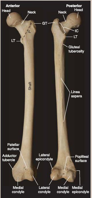 The femur (thigh bone) is the longest and heaviest bone in the body (Fig. 2). Proximally, the femur is characterized by a round femoral head (ball portion of the hip joint) and inferolaterally angled neck. The neck connects the head to the shaft of the femur adjacent to the greater and lesser trochanters-two bony prominences that serve as muscle and ligament attachment sites. The trochanters are connected posteriorly by the intertrochanteric crest and anteriorly by the intertrochanteric line. The femoral shaft is primarily smooth, except for the raised ridge of bone posteriorly, the linea aspera. Distally, the femur has rounded medial and lateral condyles that articulate with