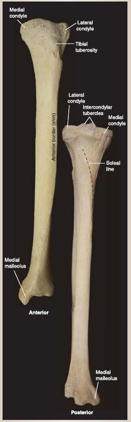 The tibia (shin bone) is the weight-bearing bone of the leg (Fig. 3). Proximally, it is characterized by flat, concave lateral and medial tibial condyles that articulate with the distal femur. Between the tibial condyles are the intercondylar eminence and tubercles,
