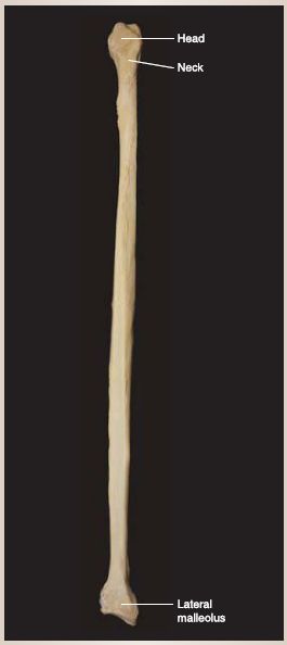 The fibula is a thin, non-weight-bearing bone in the leg that articulates laterally with the tibia. Proximally, it is characterized by an arrowheadshaped head and narrow neck, which are easily palpated superficially (Fig. 4). The interosseous border lines the medial shaft. Distally, the fibula expands into the lateral malleolus, which frames the ankle joint laterally.