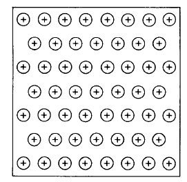 المكونه للمعدن . ويبين شكل (1) كيفية توزيع الذرات (بدقة أكثر الأيونات) في المعدن حيث ترمز كل دائرة مظللة لنواة واحدة مع الإلكترونات المرتبطة به إرتباطاً وثيقاً (أي لأحد الأيونات) ٠ أما الفراغات الغير مظللة بين الأيونات فهي تحتوي على إلكترونات التكافؤ للذرات وهي تلك الإلكترونات الحرة والغير مرتبطة بذرة محددة وتسمى الإلكترونات الفي فقدت ذاتها , وتسطيع هذه الإلكترونات الحرة أن تجول بجرية من ذرة إلى أخرى في الفراغات بين هذه الأيونات . وعلى ذلك فالمعادن عبارة عن تركيبة بلورية تحتوي على أيونات مرتبة ترتيباً دورياً منتظماً ومرتبطة يبعضها إرتباطاً وثيقاً تسبح بينها بحرية سحابة من الإلكترونات . وتعرف هذه الصورة باسم الوصف الإلكتروني الغازي للمعدن.