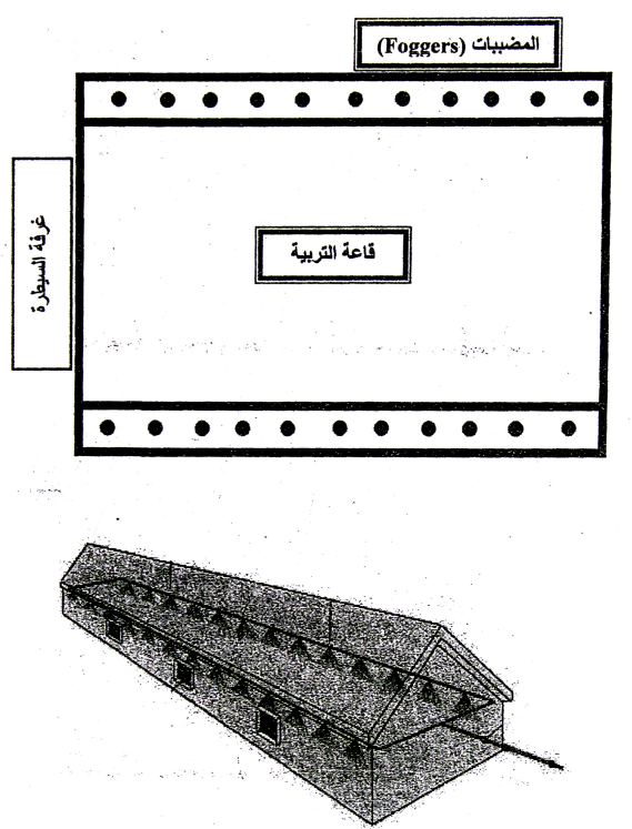 اولا:- بما أن نظام التبريد بالتبخير من وسط القاعة هو الشائع بمعظم الحقول الجديدة في الوقت الحاضر، فنرى أن تكون منطقة التبريد (غرفتي التبريد) من الجهتين اكبر، حيث يبلغ عرضها 4 متر وطولها 10-8 متر ، يتم فيها امرار الهواء الداخل في متاهة من الجدران التي يتم رشها برذاذ الماء قبل وصول الهواء الى الأخاديد المبردة، يوضح الشكل التالي اسلوب ترتيب هذه الجدران وكيفية دوران الهواء فيها مع تعرضه للرذاذ الناعم من الماء والمنطلق من البخاخات (Nozzels) المثبتة على شبكة الأنابيب الممتدة في اعلى غرفة التبريد وعلى جدران هذه الغرف ، اذن الهواء الداخل لغرفة التبريد سيتم اجباره على الدوران ثلاث مرات في جو من الضباب والتماس مع جدران باردة ليفقد حرارته تماما ويصبح بارد قبل ذهابه الى منطقة الاخاديد المبردة لتزيد من برودته قبل دخوله الى قاعة التربية، أن هذا الاجراء سوف يضاعف من كفاءة التبريد.