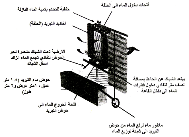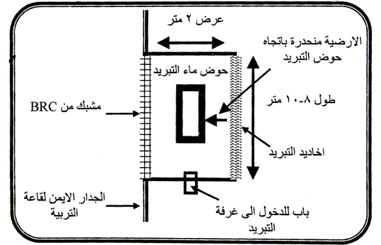 • وضع حوض ماء التبريد في المسافة المحصورة بين القاعة والأخاديد المرطبة بالماء وذلك لحمايته من أشعة الشمس وتسهيل سحب الماء وضخه لترطيب اخاديد التبريد.