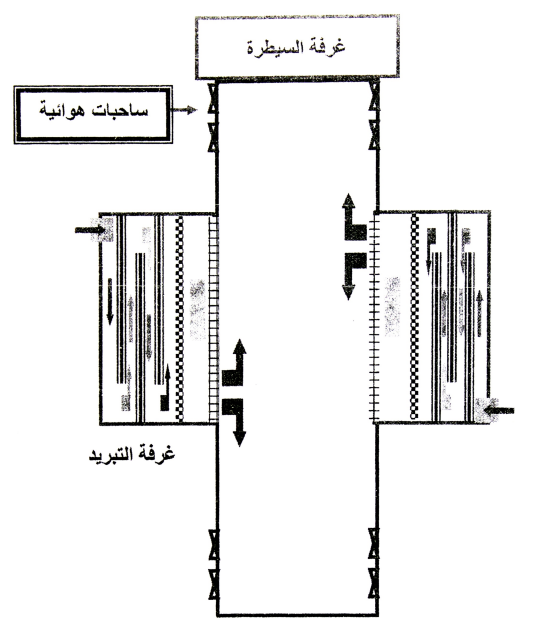 مخطط لنظام التبريد بالتبخير (Evaporating Cooling System)، اخاديد التبريد عبارة عن اطار من الألمنيوم ومشبك ملكي يحصر داخله حلفة ينزل عليها الماء من الاعلى ويتجمع اسفل الحوض ومنه الى انابيب ارجاع الماء الزائد الى حوض ماء التبريد، هذه الأخاديد توضع على شبابيك احد جهات القاعة، يتم سحب الهواء بواسطة الساحبات الهوائية من الجهة المقابلة فيضطر الهواء للدخول من خلال هذه الأخاديد ليبرد ويترطب بالماء قبل الدخول.