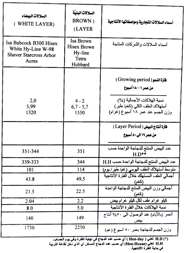 جدول يبين السلالات التجارية الحديثة للدجاج البياض المنتجة للبيض البني اللون والأبيض ومواصفاتها الإنتاجية خلال عام 2006