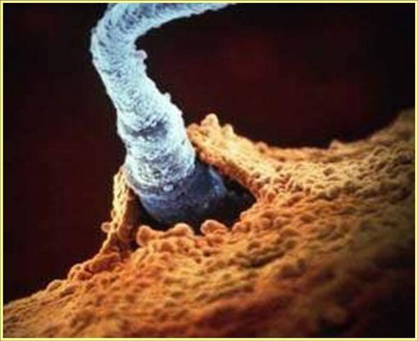 - يؤكد العلماء أنه من أكثر الظواهر غرابة في الطبيعة ظاهرة خلق الإنسان ! فخلية واحدة تنمو وتصبح أكثر من 100 تريليون خلية ، كيف تحدث هذه العملية ، ومن الذي يتحكم بهذا البرنامج الدقيق ، هل هي الطبيعة ، أم خالق الطبيعة عز وجل ؟ فعندما يدرك الإنسان أصله وهو الطين ، ثم النطفة التي لا تكاد تُرى ، يزداد تواضعاً ويتخلص من غروره وتكبره ، يقول تعالى : {يَا أَيُّهَا الْإِنْسَانُ مَا غَرَّكَ بِرَبِّكَ الْكَرِيمِ * الَّذِي خَلَقَكَ فَسَوَّاكَ فَعَدَلَكَ * فِي أَيِّ صُورَةٍ مَا شَاءَ رَكَّبَكَ} [الانفطار : 6-8]. ونرى في الصورة مجموعة كبيرة من النطاف تحيط بالبويضة ولكن واحدة فقط تخترق البويضة وتشكل الأمشاج ، حيث تختلط النطفة بالبويضة ، و“ تذوب “ فيها. الآن لو تأملنا التركيب الكيميائي للنطفة أو للبويضة نلاحظ أنها في معظمها تتألف من الماء ، ولذلك قال تعالى : {فَلْيَنْظُرِ الْإِنْسَانُ مِمَّ خُلِقَ * خُلِقَ مِنْ مَاءٍ دَافِقٍ} [الطارق : 5-6]. وتتسابق النطاف وتقترب نحو البويضة محاولة اختراقها ، والسؤال المهم : مَن الذي علَّم النطفة أن تسلك هذا الطريق في هذا الظلام ؟ ومن الذي يسوقها باتجاه البويضة ؟ يقول تعالى : {أَفَمَنْ يَخْلُقُ كَمَنْ لا يَخْلُقُ أَفَلا تَذَكَّرُونَ} [النحل : 17].