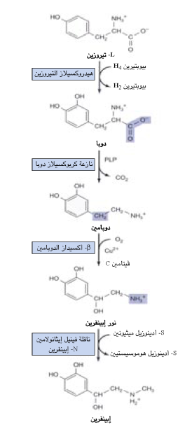 الشكل 33-9 : تحول التيرونين إلى الإبينفرين والنورإبينفرين في الخلايا العصبونية والكظرية. (PLP: بيريدوكسال فسفات).