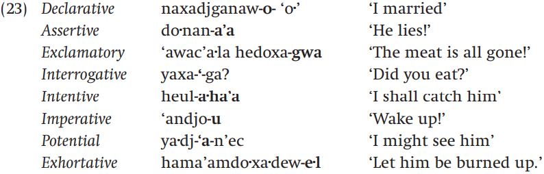The now-extinct language Tonkawa (Coahuiltecan) had eight suffixes signaling different moods/modalities. Mood suffixes are shown in bold: