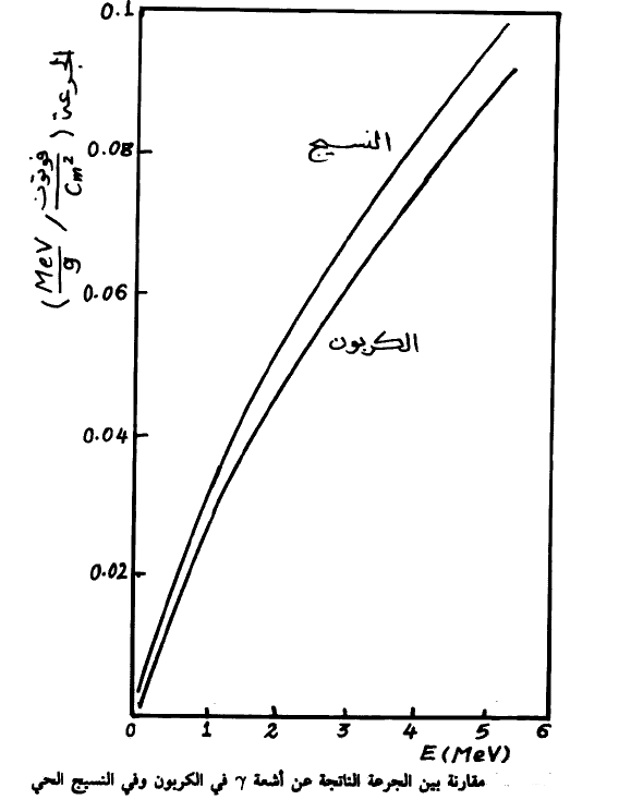 كما ويمكن تصميم جهاز يقي الجرعة الناتجة في النسيج الحي بمقارنتها مع جرعة في مادة قريبة من تركيبة كالكربون مثلا. نبين في الشكل (3) مقارنة بين الجرعة الناتجة عن أشعة γ في الكربون وفي النسيج الحي. حيث يتضح أنها تقريباً متساوية في الاثنين. كما ونبين في الجدول (1) أضعاف الفوتونات ذات طاقة 60 ك. أ. ف. عند