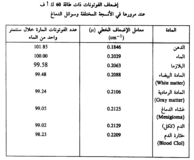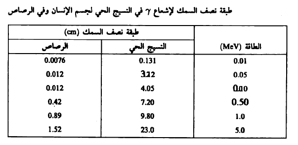 أما في الجدول (3) فنبين طبقة نصف السمك لإشعاع. فيكل من النسيج الحي في جسيم الإنسان وفي الرصاص وذلك بغرض إجراء مقارنة بسيطة.