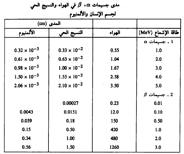 ولغرض استكمال الفائدة نبين في الجدول (2) مدى جسيمات α، β في كل من الهواء والنسيج الحي للإنسان والألومينيوم.
