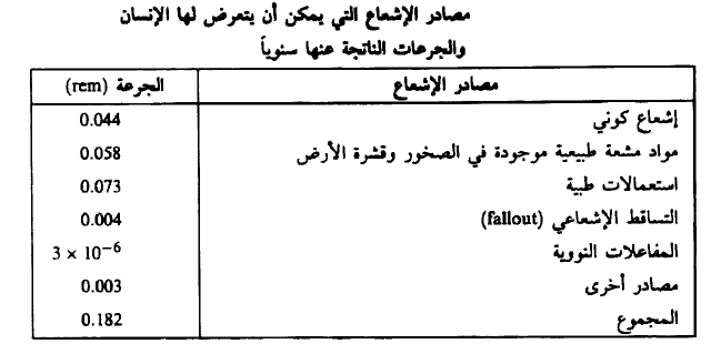 وأخيراً نبين في الجدول (4) مصادر الإشعاع التي يمكن أن يتعرض لها الإنسان والجرعات المكافئة الناتجة عنها، ومجموع هذه الجرعات جميعاً.