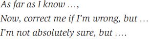We use certain types of expressions, called hedges, to show that we are concerned about following the maxims while being co-operative participants in conversation. Hedges can be defined as words or phrases used to indicate that we’re not really sure that what we’re saying is sufficiently correct or complete. We can use sort of or kind of as hedges on the accuracy of our statements, as in descriptions such as His hair was kind of long or The book cover is sort of yellow (rather than It is yellow). These are examples of hedges on the Quality maxim. Other examples would include the expressions listed below that people sometimes put at the beginning of their conversational contributions.