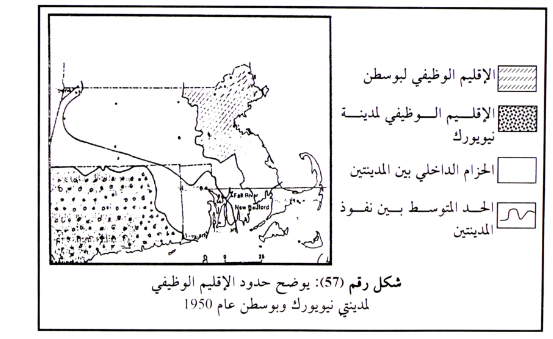 وقد تمكن الأستاذ . جرین Green من توضيح الخط الفاصل بين المدينتين، بناءاً على المعايير المذكورة آنفاً، حيث قسم المنطقة بالتساوي إلى منطقتين وظيفتين. كما هو مبين في شكل (57). وقد حصر هذا الحد، داخل المنطقة المحصورة فيه نحو 50% من النشاطات التي جذبتها المدينة الأولى أو الثانية. وعلى الحد نفسه يقسم السكان اعتماداتهم المالية بين المدينتين بالتساوي .
