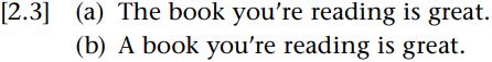You are likely to interpret (a) as referring to any book you are currently reading (apologies for the immodesty!). But with (b), it could be about any book you are currently reading (this book, other course books, the novel you read when you go to bed, etc.). (b) contains the indefinite article a, contrasting with the definite article the. Apart from noun phrases with determiners, pronouns (e.g. I, you, she, it) can express definiteness in English, as can proper nouns, a topic we will discuss below.