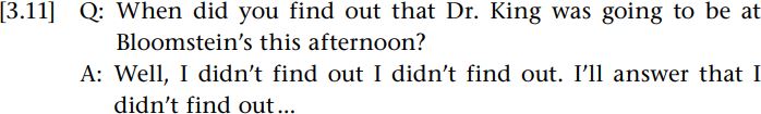 Clearly, Curry worked out the presupposition embedded in the WH-structure (i.e. that she had found out), despite the fact that it was not common ground. Blocking this kind of presupposition is diffi cult, as one has pointedly to avoid answering the question; to do so would mean accepting what is presupposed. Cross-examination discourse from prosecutors is often designed to get a defendant or witness to accept, inadvertently or otherwise, assumptions that point towards their guilt. And presuppositions are powerful. Loftus and Palmer (1974) tested the sentence with which we began this topic: About how fast were the cars going when they smashed into each other? This is one of the questions they put to subjects about a fi lm they had been shown. The WH-structures presuppose that the cars were going “fast” and, moreover, “smashed” into each other, something which seems to explain the fact that informants were more likely to subsequently recall the presence of broken glass (though none was actually to be seen in the fi lm) than if, instead of “smashed”, the question contained “hit” or “bumped” (see also Loftus 1975).