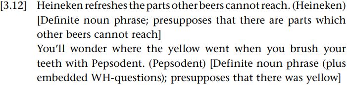 One way of packing in information into the short space available in the slogan, and also of creating a dramatic and memorable slogan, is to deploy presuppositions. In addition, part of the sales pitch can be through the presupposition. Such presuppositions create the ground against which the product shines. In some cases, the presuppositions seem designed to create surreptitiously a problem or need for which the product is the solution. In the Pepsodent toothpaste advertisement, the existence of yellow on your teeth is presupposed (the yellow). In all these cases, presuppositions are part of the advertiser’s “soft sell” strategy. For more on the persuasive use of presuppositions, see Sbisà (1999).