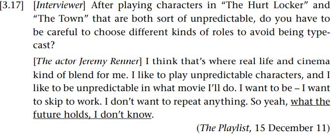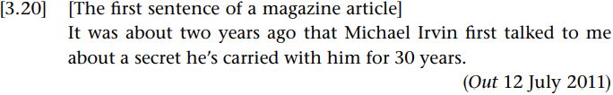We briefly met cleft sentences, our example being an it-cleft: It wasn’t me that drove fast. Cleft sentences are complex sentences, where what could have been represented as a simple sentence (e.g. I didn’t drive fast) is cleft (split) into two clauses. In our it-cleft example the main clause is It wasn’t me and the subordinate clause is that drove fast. It-clefts tend to foreground the new information they carry in the clefted constituent, after the verb “to be”. Thus, me carries the focus. Conversely, the subordinate clause, that drove fast, is presupposed, old information and the topic. Compare our it-cleft example with I didn’t drive fast. Here, I is the topic and the rest the focus.