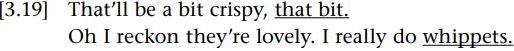 With right dislocation there is a much stronger requirement that what is referred to in the right-dislocated phrase refers to something that is not only participant-old but also discourse-old. This tallies with the fact that such structures tend to function to clarify the reference of a pronoun in the main clause, as in the following examples (both taken from Biber et al. 1999):