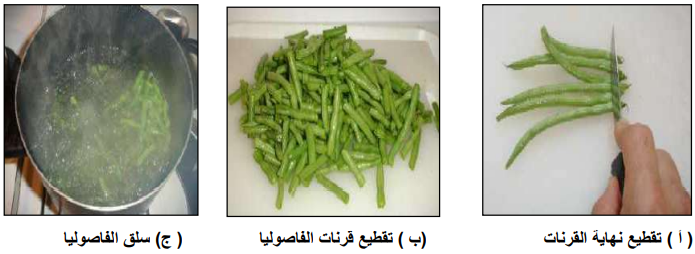 1- تعلب الفاصوليا كامله او مقطعة إلى قطع يتراوح طولها ما بين 1.5-2cm او تعمل على شكل شرائح وحسب الرغبة كما في (الشكل ب).