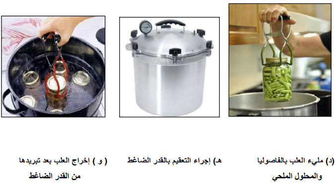 6- إجراء عملية التعقيم وذلك برفع درجة حرارة العلب إلى درجة 116 درجة سليزية المدة تتراوح بين (60-20 دقيقه) وبالمتوسط 40 دقيقة، بوضعها في قدور للتعقيم (القدر الضاغط) كما في (الشكل هـ).