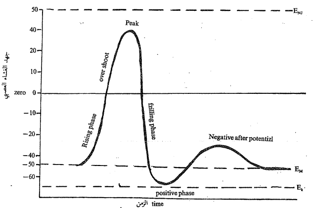 الراحة، وبذلك تعود قيمة Em الى القيمة العادية لها وان اعادة الاستقطاب repolarisation يكون الجزء النازل Falling phase لمنحني ال Action Potential وعندما يسترد الغشاء جهد الراحة تكون نفاذية البوتاسيوم لاتزال أكبر من الحالة العادية لذلك فان قيمة Em تقل عن قيمة ال Resting Potential وتكون في نفس الوقت اعلى من قيمة اتزان البوتاسيوم Ek وهذا الجزء يعرف بالـ Positive phase لل Action Potential ولكي تعود قيمة Em للقيمة الطبيعية فان ايونات البوتاسيوم تتحرك لخارج الخلية والتراكم المؤقت لأيونات البوتاسيوم خارج الغشاء العصبي يقلل من نسبة الزيادة لأيونات البوتاسيوم وتكون النتيجة ان قيمة Em تصبح قيمة سالبة بالنسبة لقيمتها في حالة Resting Potential، وهذا الجزء السالب يعرف بال Negative after potential، وفي نهاية الامر تعود النفاذية الايونية للغشاء العصبي الى الحالة الطبيعية وتعود قيمة Em الى قيمتها الطبيعية.