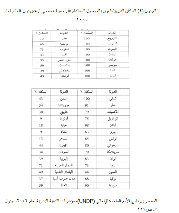 وتعد مشكلة الصرف الصحي مشكلة عالمية تعاني منها أغلب مدن العالم، لاسيما في الدول النامية، إذ يفتقر حوالي 2.6 بليون نسمة إلى خدمات الصرف الصحي. كما تعد هذه المشكلة مشكلة عالمية توليها المنظمات الأممية أهمية خاصة بسبب انعكاساتها الصحية. والفجوة في أنظمة الصرف بين البلدان المتقدمة والنامية خير دليل على عدم المساواة في التنمية البشرية بين بلدان العالم(3). وهذا ما يوضحه (الجدول 4) الذي يبين نسبة السكان الذين يحصلون على خدمات الصرف الصحي المستدام بحسب دول العالم، ومنه يظهر التباين الكبير بين الدول والأقاليم. ولاشك أن هذا التباين انعكس على مشاكل الصحة العامة التي تعانيها البلدان التي تعاني نقصاً في هذا المجال، فقد انتشرت فيها الأمراض والأوبئة، لاسيما تلك التي تصيب الأطفال دون الخامسة.