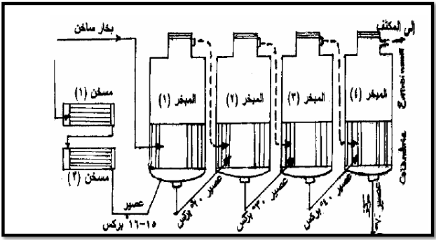 يتم تركيز العصير للوصول إلى (60 - 65 برکس) كي يكون العصير جاهزا للبلورة، ويتم ذلك باستخدام مبخرات متعددة ومتتالية حيث يتم تركيز العصير فيها باستخدام درجات حرارية متزايدة كما في الشكل (2).