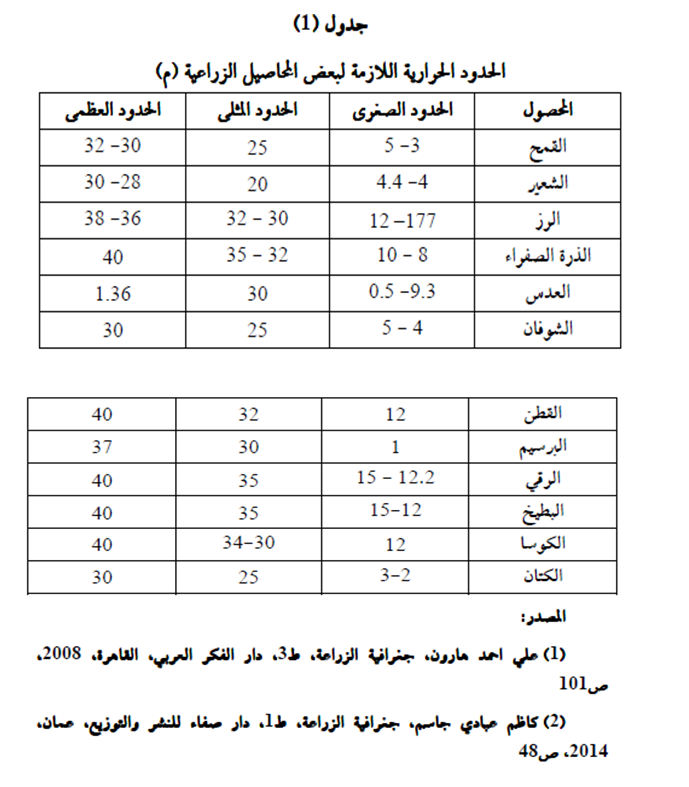 أ- درجة الحرارة الصغرى(temperature growth Minimum): يمكن تعريفها على انها الدرجات الحرارية الصغرى التي يتطلبها النبات لكي ينمو وهي مختلفة من نبات إلى آخر وكذلك من صنف نباتي إلى آخر ومن طور نباتي إلى آخر وهذا الاختلاف يمكن تفسيره إلى أن بعض هذه في النباتات شتوية لذا تحتاج إلى درجات حرارة صغرى أقل من المحاصيل الصيفية فضلا عن اختلاف العروض والمناطق التي تنمو فيها تلك النباتات فقصب السكر مثلا يعد من المحاصيل المدارية التي تحتاج مناخ دافئ طول العام لا تقل درجة حرارته عن (80 ف)، وكذلك شجرة النخيل تحتاج إلى درجة حرارة (9م) كحد ادني من درجات الحرارة الصغرى. وهذا ما يوضحه جدول رقم (1) من اختلاف في الحدود الحرارية لبعض المحاصيل الزراعية.