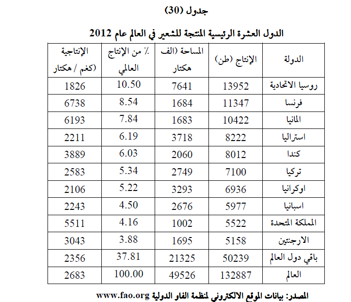 - المانيا: تنتشر زراعة الشعير في المانيا ضمن الفسحات الغابية في مقاطعة بافاريا، وفي شمال الراين حيث تقع مدينه دورتموند التي تعد منة أهم مدن إنتاج البيرة في البلاد والتي يصل إنتاجها إلى (4) مليون برميل سنويا. بلغ إنتاجها من هذا المحصول حوالي (10422) مليون طن أي ما نسبته (%7.84) من الإنتاج العالمي وعلى مساحة بلغت (1683) ألف هكتار، ومن حيث الإنتاجية فقد جاءت بالمرتبة الثالثة بين الدول المنتجة للمحصول الشعير إذ بلغت (6193 كغم/ هكتار) كما يوضح جدول (30).