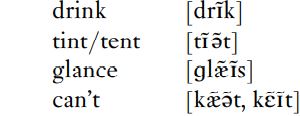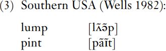 In some varieties of English, syllable-final nasal consonants do not always occur, but are manifest only through the nasalization of vowels. This phenomenon is reported for English in the Southern USA (Wells 1982: 541), where a sequence of vowel + nasal + voiceless plosive can be produced as a nasalized vowel + voiceless plosive. All the same ‘ingredients’ are present, but they are reordered in time so that nasal airflow occurs concurrently with the open resonant articulation needed for the vowel, and there is no discrete portion which has nasality + closure. (This variety, in common with many others in the USA, has vocalic on-glides into some consonants.)