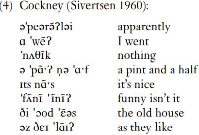 Here are some examples taken from Cockney English (the traditional dialect of London, especially the eastern part of the city), recorded in the early 1950s from the speech of people born in the 1890s (Sivertsen 1960). What is recorded here, then, is ‘conservative’ or ‘traditional’, from a modern perspective. The distribution of nasalization in Cockney is under-researched: it occurs in the context of nasal consonants, and is commonly found on open vowels; it is also a property of the voice quality used by Cockney speakers. The transcriptions have been simplified a little.