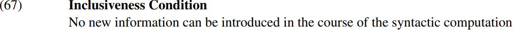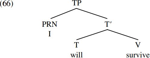 The reason why the bar notation used in trees like (66) violates inclusiveness is as follows. When the word will is taken out of the lexicon, its lexical entry specifies that it has a set of properties which include the grammatical properties represented by the category label T in (66). But the tree in (66) tells us that when will is merged with its complement survive, the resulting string will survive belongs to the category T-bar – in other words, it is an intermediate projection of will. Likewise, the tree in (66) also tells us that the larger string I will survive is a TP – in other words, it is the maximal projection of will. But this information about intermediate and maximal projections is not part of the lexical entry for will, and hence must be added in the course of the syntactic computation. However, adding such information about projection levels violates the Inclusiveness Condition (67).