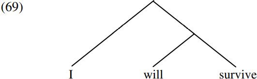 Given the possibility (mentioned in §2.11) that categorial information (i.e. information about the category that an item belongs to) can be represented in terms of grammatical features (and hence subsumed within the set of features which characterize the idiosyncratic properties of individual words), a further possibility is that category labels like those in (68) can be entirely replaced by sets of features, so opening up the possibility of developing a theory of bare phrase structure – i.e. a theory in which there are no category labels in syntactic trees. An even more radical possibility along these lines would be for the structure of I will survive to be represented in terms of an unlabeled tree diagram like (69) below: