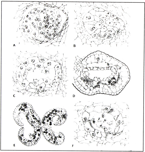 (F): قطاع عرضي في متوك الساتزوما يوضح تحلل حبوب اللقاح.