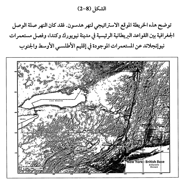 لعل العمليات العسكرية الأجدر بالذكر خلال حرب الاستقلال الأمريكية هي التحصينات والمعارك بهدف السيطرة على نهر هدسون، والتي أدت في نهاية المطاف إلى إنشاء قلعة ويست بوينت. وأصبحت هذه التحصينات ضرورية لأن نهر هدسون كان مركز الثقل الاستراتيجي في الحرب، والسيطرة على هذه المزية المهمة كانت حاسمة (1969 Palmer). ومن ثم، لم يدم الأمر طويلا بعد بدء الحرب حتى سعت القوات البريطانية والأمريكية للسيطرة على شبكة الممرات المائية الاستراتيجية ل"نهر هدسونبحيرة تشامبلين-نهر سان لوران" التي كانت حيوية في الهندسة الاستراتيجية للحرب؛ وذلك لسببين: الأول، أنها كانت الخط الطبيعي الفاصل بين نيو إنجلاند ومستعمرات إقليم الأطلسي الأوسط يضم نيويورك ونيوجرزي وبنسلفانيا)، وبالسيطرة عليها، استطاع البريطانيون دق إسفين بين مركز التصنيع والمركز الزراعي للمستعمرات، وبالتالي كسر المجهود الحربي. والثاني، أن هذا الممر المائي مرتبط مادية بالقواعد البريطانية في مدينة نيويورك ومونتریال (انظر الشكل 8-2). ومن ثم، كان الاستيلاء على الممر المائي من قبل المستعمرين ضرورية للحيلولة دون تركيز الجهد العسكري البريطاني وتفتيت قدراته على العمل في انسجام تام (1969 Palmer).