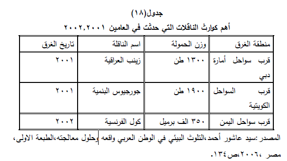 7- تسرب النفط إلى البحر خلال ما يعانيه العالم من حروب كما حدث خلال حرب الخليج الثانية) جدول (۱۸).
