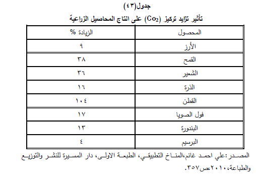 يسهم ارتفاع تراكيز غاز (Co2) في تزايد حجم النبات ونموه فضلا عن تزايد سطح أوراقه وتزايد قوته ومقاومته للظروف المناخية جدول (43)، وانتشار زراعة عدد من النباتات في مناطق لم تكن ملائمة لزراعتها في مناطق جافة وشبة جافة ، فضلا عن توسع مساحة زراعة الرز على حساب محاصيل اخرى كذلك زراعة القمح سينتشر في كندا وسهول روسيا وفي مواقع اخرى تعمل الحرارة العالية على إعاقة تلقيح النبات خلال فترة الإخصاب وهذا سيؤثر سلبا على جودة القمح و كميته. ويعمل ارتفاع درجات في إحداث تغيرات في خصائص المناخ من شدة الحرارة و قلة الأمطار، فمثلا المناطق الرئيسة لزراعة الحبوب في أمريكا الشمالية أذ يتوقع أن تصبح أكثر حرارة و جفاف والمحتمل أيضا أن تقل الأمطار في تلك المنطقة و هذا سيؤثر سلبا على الزراعة بشكل عام.