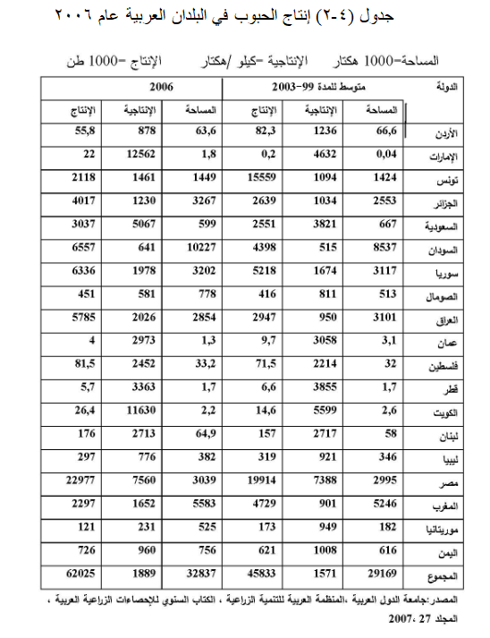 إن زيادة الإنتاج الزراعي يعتبر المدخل الرئيسي لتحقيق التنمية ويمكن تحقيق ذلك من خلال التوسع الراسي والتوسع الأفقي، ويمتاز الإنتاج الزراعي في الدول العربية بشكل عام بالتذبذب من سنة إلى أخرى وتباين كمية الإنتاج بين الدول العربية تبعا لتوفر الإمكانيات الطبيعية التي تتحكم بالاستثمار الزراعي. او من خلال تحليل الأرقام الواردة في الجدول الذي يمثل إنتاج الحبوب (القمح، والشعير، والذرة، والرز) في البلدان العربية، يتبين من خلال مقارنة متوسط النتاج الحبوب المدة 1999-2003 ومقارنتها مع الإنتاج عام 2006، يتبين إن هناك زيادة طرأت على الإنتاج، فقد كان متوسط الإنتاج من الحبوب 45833000 طن أصبح 62025000 طن عام 2006، وهذا يعطي مؤشر جيد على وجود توسع في زراعة الحبوب في الدول العربية بشكل عام بالرغم من تباين الإنتاج بين الدول العربية فالبلدان التي حققت زيادة في الإنتاج هي على سبيل المثال تونس ارتفع فيها الإنتاج من 1559 ألف طن إلى 2118 ألف طن ، والجزائر من 2639 إلى 4017 ألف طن وسوريا من 5218 ألف طن إلى 6336 ألف طن عام 2006 ، ومصر 19914 ألف طن إلى 22977 ألف طن ، بينما انخفض الإنتاج في بعض الدول العربية، فقد انخفض الإنتاج عند مقارنة متوسط الإنتاج للمدة 1999-2003 مع الإنتاج عام 2006 في كل من الأردن، وعمان ، وليبيا، وموريتانيا بنسبة تراوحت بين 10 - 15% .