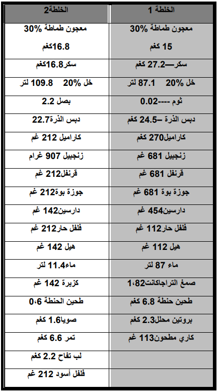 المواد المستعملة: عصير طماطة، سكر، خل، ملح، بهارات.