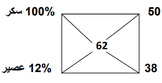 من المربع نجد أن لكل 38 جزء من عصير تركيزه %12 يحتاج إلى إضافة 50 جزء سكر ليصبح تركيزه %62.