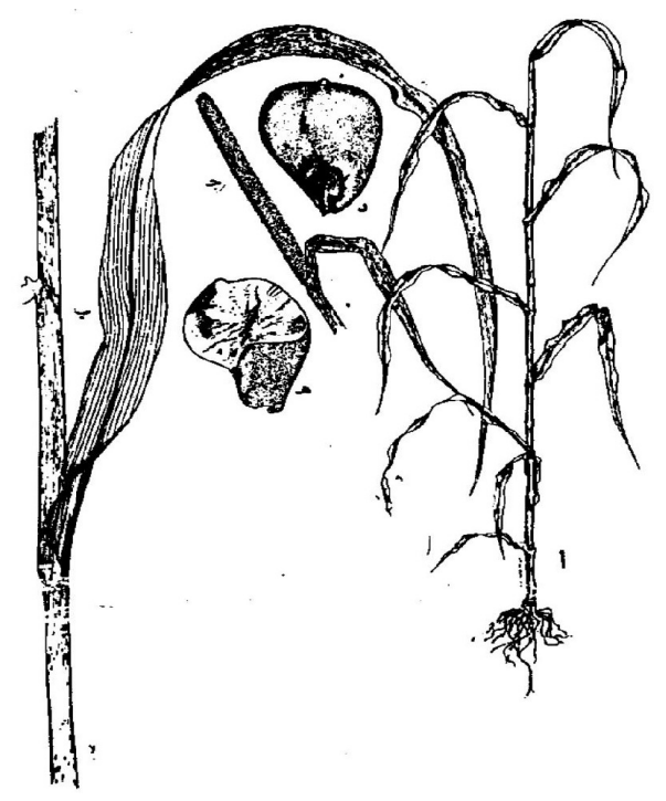 شكل (١). الدخن بنيسيتم تيفويدز: أ- نبات قبل طرد النورة. أ- الورقة وجزء من الساق. جـ- النورة. د- الحبة. هـ- قطاع طولي في الحبة