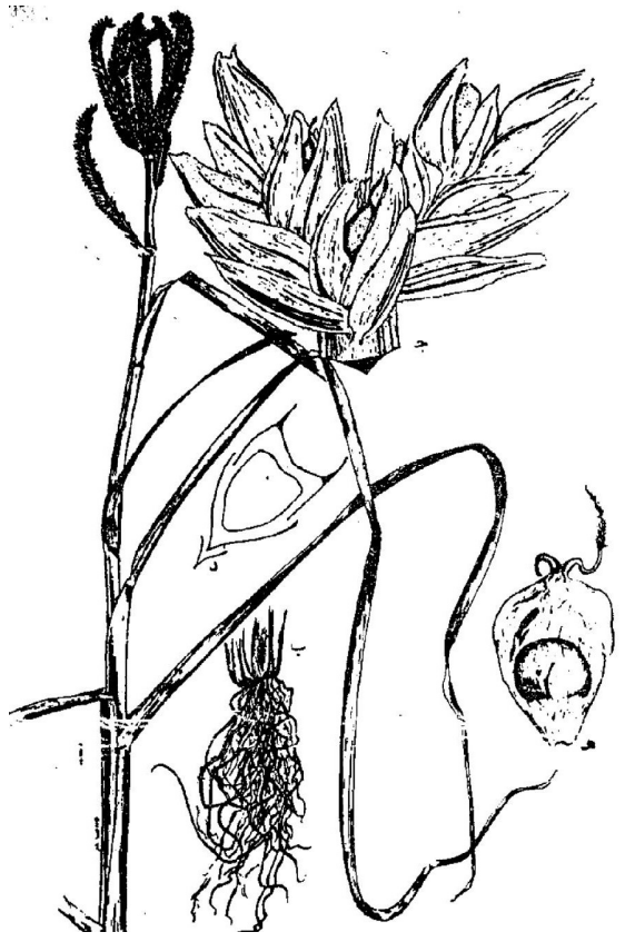 شكل (٣). دخن الإصبع (أليسين كوراكانا): أ- الجزء العلوي من نبات يحمل نورة. ب- قاعدة النبات. جـ- السنيبلات. د- قطاع عرضي في العصافة الخارجية والداخلية هـ- الثمرة.