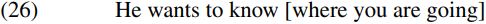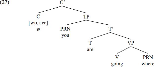 The bracketed wh-question clause in (26) is derived as follows. The verb going is merged with its complement where (which is a locative adverbial pronoun) to form the VP going where. The present-tense auxiliary are is then merged with the resulting VP to form the T-bar are going where. The pronoun you is in turn merged with this T-bar to form the TP you are going where. A null complementizer [C ø] is subsequently merged with the resulting TP. Since the relevant clause is a wh-question, C contains a [WH] feature. In addition, since English (unlike Chinese) is the kind of language which requires wh-movement in ordinary wh-questions, C also has an [EPP] feature requiring it to have a specifier. Given these assumptions, merging C with its TP complement will form the C-bar in (27) below (where features are CAPITALIZED and enclosed within square brackets):