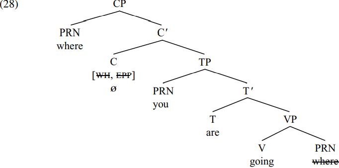 (A minor descriptive detail is that the locative adverbial pronoun where is categorized here as a PRN/pronoun, though it could equally be assigned to the category ADV/adverb.) The [WH] feature of C allows C to attract a wh-expression. The [EPP] feature of C requires C to project as its specifier an expression which has a feature which matches some feature of C: since C carries a [WH] feature, this amounts to a requirement that C must project a wh-specifier. On the assumption that the wh-pronoun where carries a [WH] feature, this means that C will attract the wh-pronoun where to move from the VP-complement position which it occupies in (27) above to CP-specifier position. If we suppose that the [WH] and [EPP] features carried by C are deleted (and thereby inactivated) once their requirements are satisfied (deletion being indicated by strikethrough), we derive the structure (28) below (assuming, too, that the phonological features of the trace of the moved wh-constituent where are also deleted):