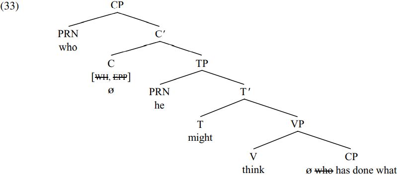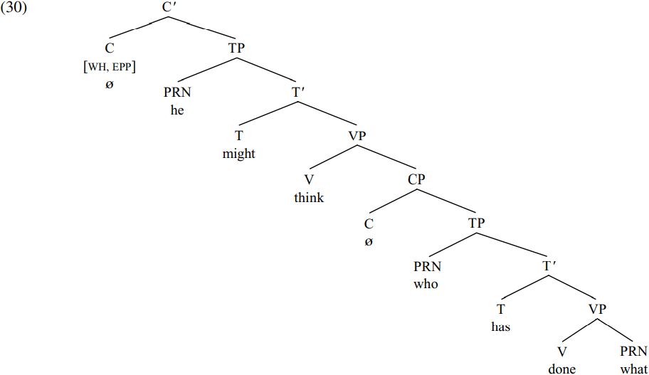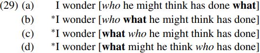 The EPP analysis of wh-movement has interesting implications for the syntax of multiple wh-questions which contain two or more separate wh-expressions. (See Dayal 2002 for discussion of the semantic properties of such questions.) A salient syntactic property of such questions in English is that only one of the wh-expressions can be preposed – as we see from the fact that in the bracketed interrogative clauses in (29) below, only who can be preposed and not what: