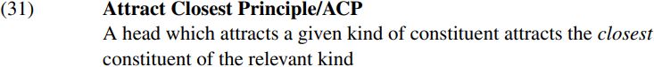 (Chomsky 1995, p. 311 proposes an analogous principle which he terms the Minimal Link Condition and formulates it thus: ‘K attracts
