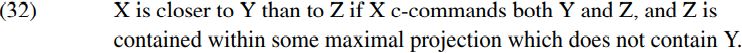 However, the idea that grammars might employ a counting algorithm of some kind in order to determine how syntactic operations apply is implausible, since counting otherwise seems to play no part in syntax – for instance, we find no syntactic operations which target (e.g.) the fourth constituent in a sentence, or which invert the second and third constituents. Moreover, the notion of counting is alien to the spirit of Minimalism, which assumes that the only primitive relations in syntax are structural relations like contain and c-command which come about via merger. From a theoretical perspective, it is therefore preferable to define relative closeness in terms of structural relations. There are a variety of ways of doing this (see Fitzpatrick 2002), but for present purposes we can make the following assumption (where X, Y and Z are three different constituents):