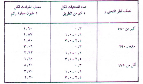 وقد وجد من الدراسات الخاصة بحوادث المرور أن تأثير الانحدار الطولي ونصف قطر المنحنيات، لا يبدي في الوقت الحاضر أي تأثير معقد على أحوال أو ظروف المرور ، وأن توافق المنحنيات ذات نصف القطر الكبير مع انحدارات صاعدة بين ۲ ، ٤% يؤدي إلى انخفاض عدد حوادث الطريق . ولقد تم بحث تأثير تكرار وجود المنحنيات على الطرق في الولايات المتحدة الأمريكية والجدول رقم (1) يوضح العلاقة بين معدل حوادث الطرق وبين نصف قطر وعدد المنحنيات الأفقية للطريق :
